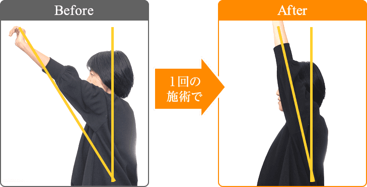 半年以上前から整形外科でのリハビリ、接骨院での施術を受けましたが、改善されず、紹介で当院に来院されました。施術前は服を着るのにも痛みが伴い苦労していましたが、施術後は自分の背よりも高い場所にある洗濯物を干す家事も楽にできるまで改善しました。